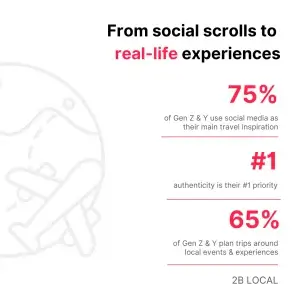 - Social media is their main inspiration source – Platforms like TikTok and Instagram are where Gen Z and Millennials discover new destinations and experiences.⁶ This makes them naturally open to using an app like 2B LOCAL as an additional trusted source for travel inspiration.